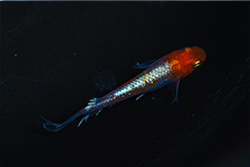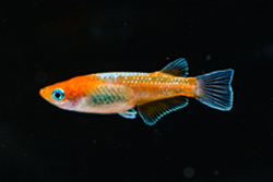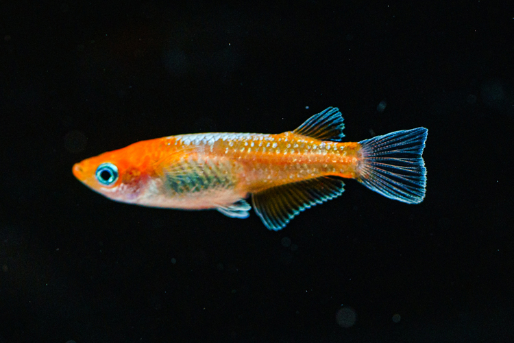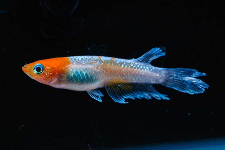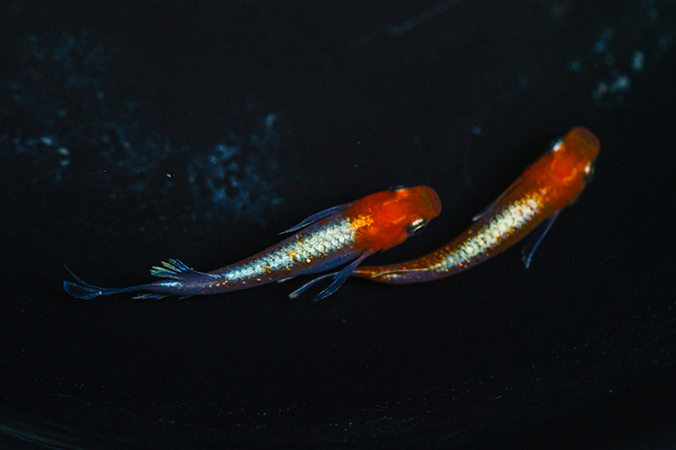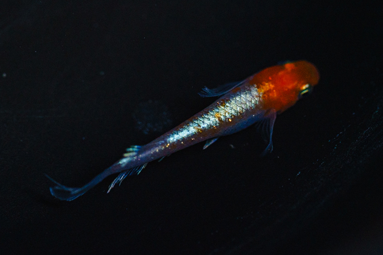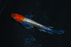 松井ヒレ長系の伸長するヒレに赤いボディ、背中の体外光が美しいメダカです。屋外で暗い容器で鑑賞しても良いし、ヒレが長く伸びた個体は横見でも非常に美しく見応えのあるメダカです。
